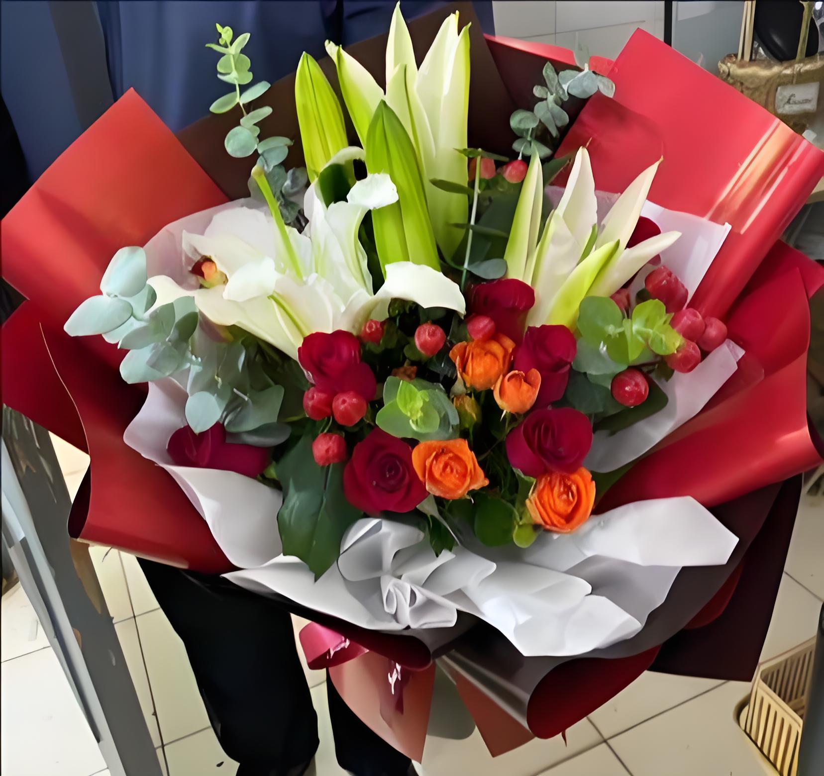 贺州钟山县花店包11枝红玫瑰、2枝多头白百合、6枝橙色多头玫瑰、红豆、尤加利叶